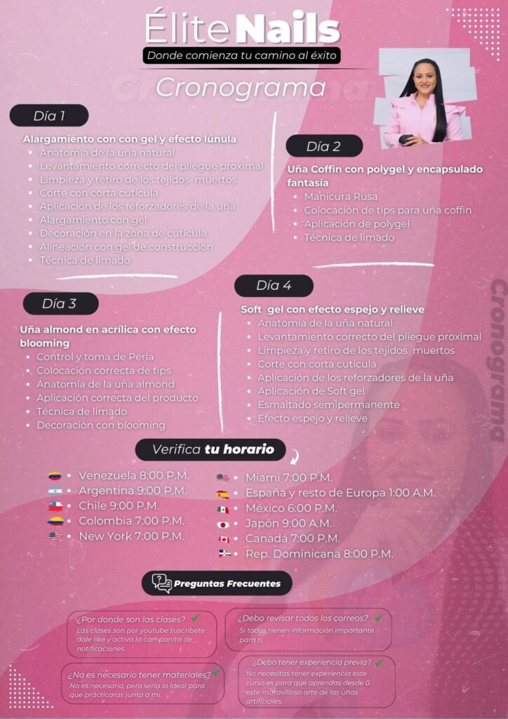 Aprende todo sobre el mundo de las uñas en 4 clases virtuales GRATIS donde te enseñaremos paso a paso desde lo básico hasta tĂ©cnicas profesionales como acrĂlico, polygel y soft gel. Podras comenzar a generar de $500-$2,000 mensuales desde casa, nos vemos el 12, 13, 14 y 15 de marzo